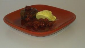 …sa sladoledom od vanilije i voćnim preljevom… Potrebni sastojci: 110 g brašna 240 g čokolade za kuhanje 40 g maslaca…